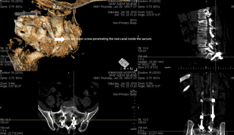 AFTER FIXATION OF L1 DOWN TO S1 WITH LOWER SCREWS PENETRATING THE S1 ROOTS BOTH
