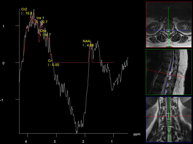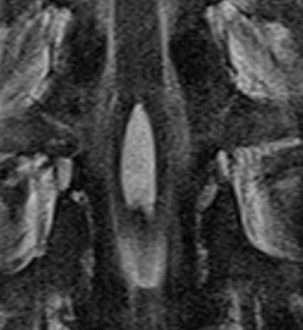 Coronal T2 weighted MRI showing the cystic lesion inside the conus
