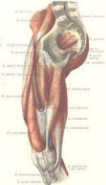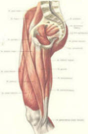 1. Gluteus maximus: A massive muscle taking origin from the outer surface of the iliac bones , the thoraco-lumbar fascia , lateral aspects of the sacrum and coccygeum and sacrotuberal ligament, going down. The anterior part of the muscle transforming to wide ligament, running around the lateral aspect of the major trochanter continue in the form of iliotibial tact. The posterior part of the muscle anchor to the gluteal tuber of the femur. In addition to hip extension, it rotate the hip laterally. With tension it keep pelvic and trunk balance. The innervation is from L5-S1 roots through the sacral plexus.