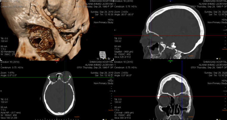 INTRAORBITAL AND RIGHT ETHMOIDAL EXTENSION WITH BLIND LEFT EYE AND EXOPHTHALMUS.