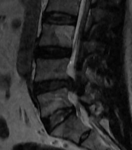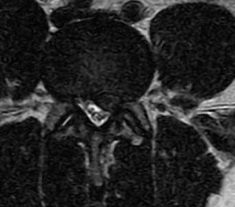 The extruded disc L4-5 in sagittal and axial views.
